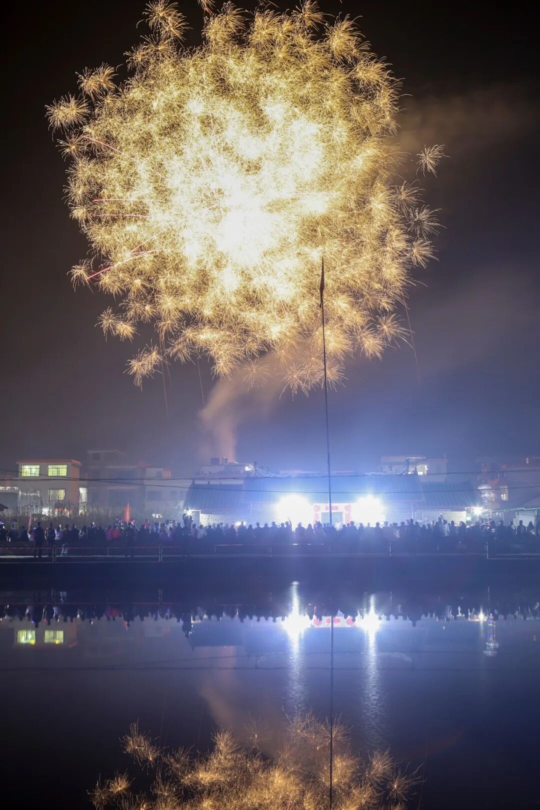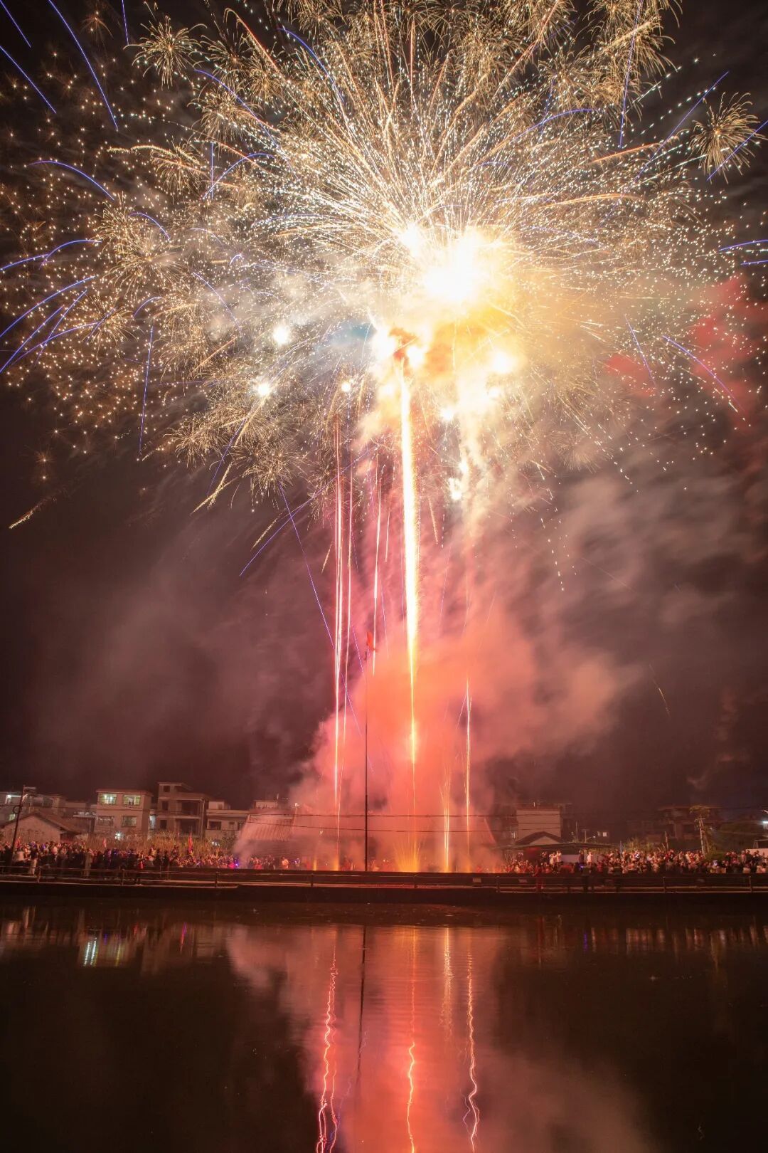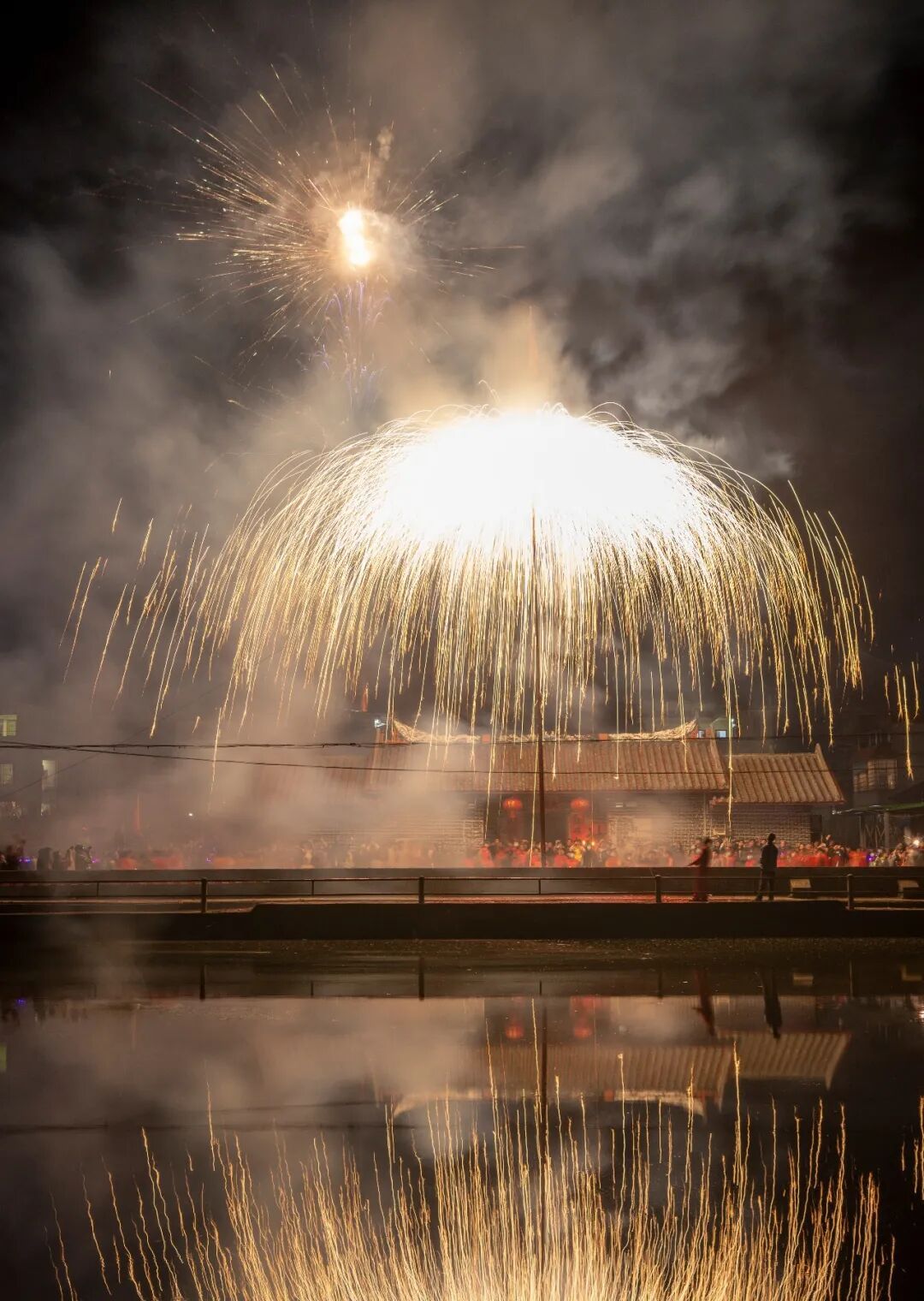 祠堂前,彩门被悬挂于高空竹架之上,内置烟花与寓意吉祥的红包,象征着好运与祝福。一声令下,村里青年争先上阵,手持点燃的炮仗奋力投掷,力求精准引燃彩门引线。随着最后一枚彩门被成功点燃,烟花腾空绽放,全场欢呼沸腾。这一集祈福、竞技、娱乐于一体的非遗项目,在传统流程与现代互动的交融中,展现了强大的生命力与凝聚力。