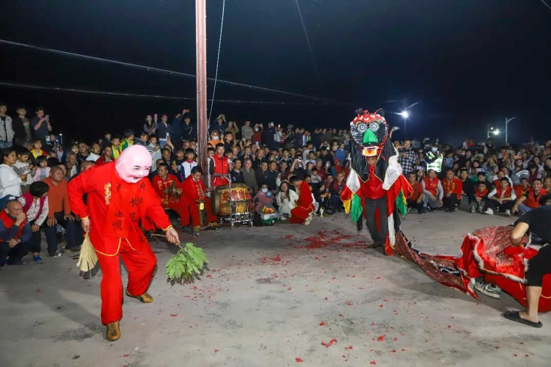 当晚,掷彩门核心展演正式拉开帷幕。内场首先上演了气势磅礴的舞狮表演,狮子腾跃翻飞,寓意驱邪纳福;紧接着是村民拳师带来的传统武术展演,刚劲有力,彰显尚武精神。随着开场表演落幕,首轮烟花齐发,一瞬间照亮夜空,将现场气氛推向高潮,当晚的重头戏“掷彩门”正式开始。