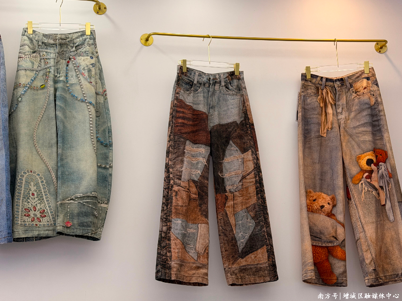 兴耀服装有限公司主理人丽塔表示:“我们自主研发的3D数码印、热转印工艺产品,环保立体、耐磨耐洗,是今年的潮流爆款。小熊图案款每天补货量3000到5000件,弯刀裤每天补单3000件以上,都是年轻人喜爱的炸街潮款。”