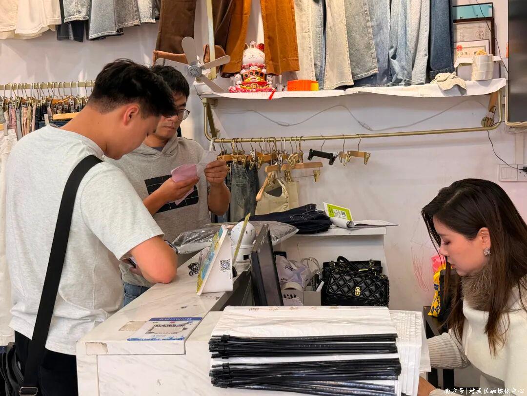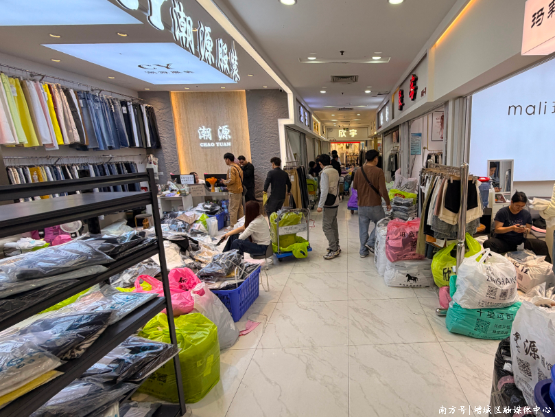 在新塘服装城,供应商从年初八起陆续复市,市场人气爆棚、订单不断,店员忙着打包、发货,洽谈订单的商户与采购商络绎不绝。